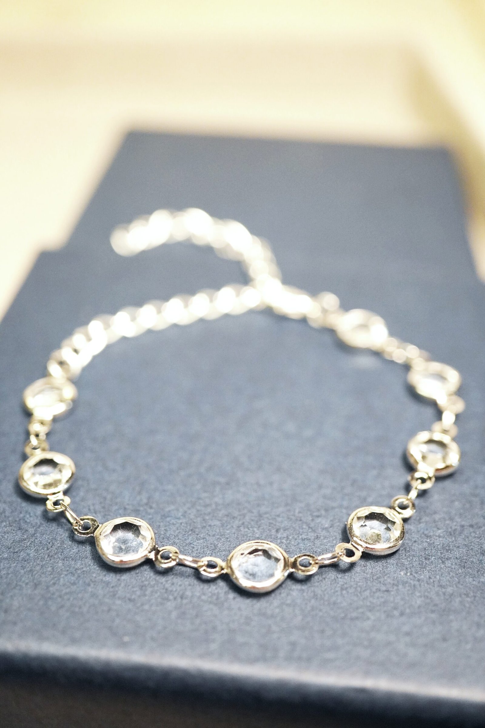 Handmade bracelet featuring bezel-set faceted glass crystals on a silver-tone zinc alloy chain. Available in two colors for easy stacking and everyday wear.