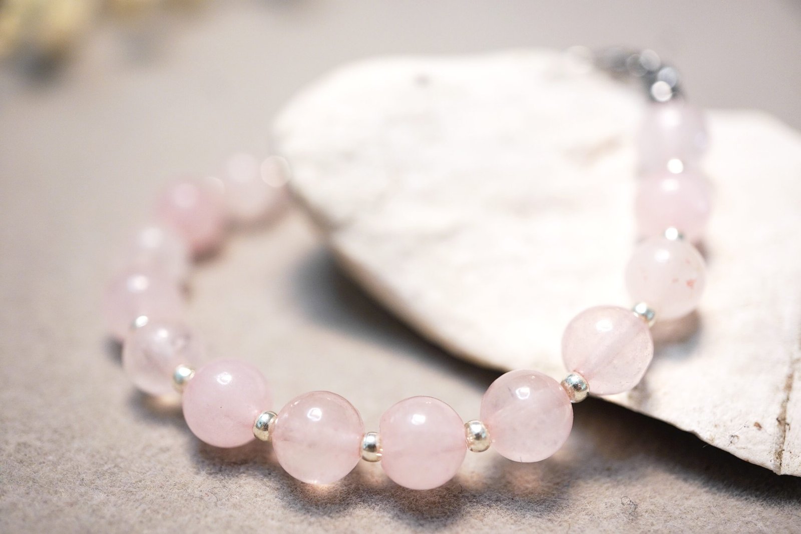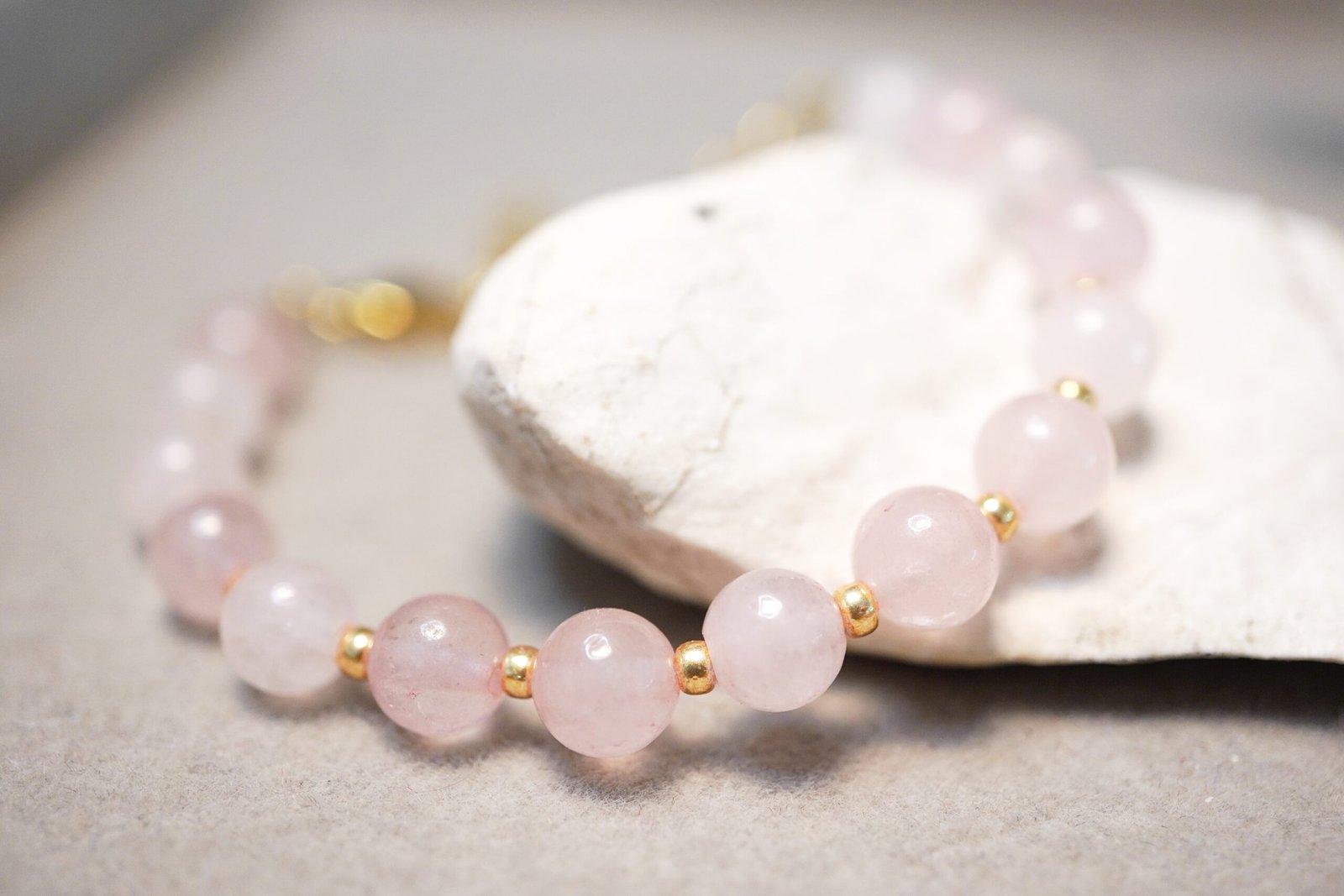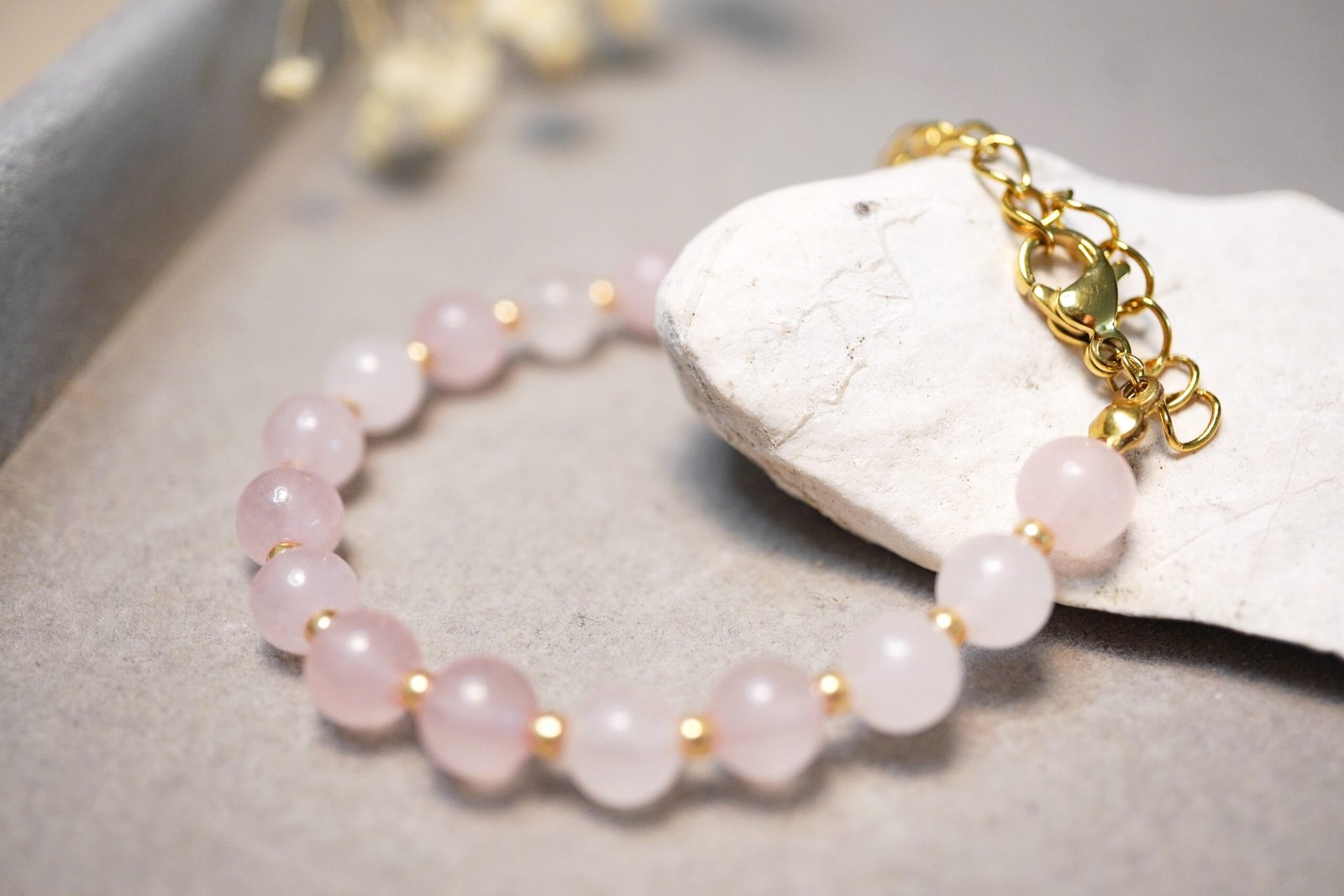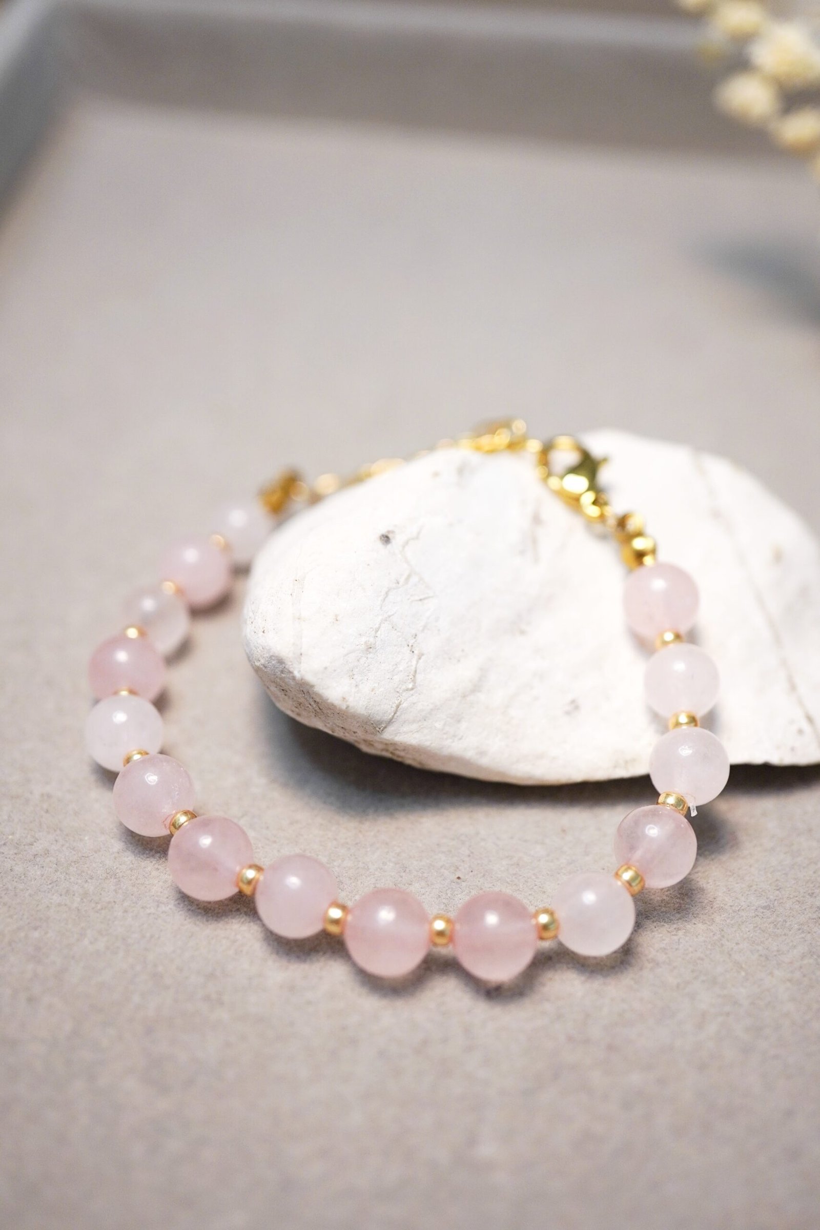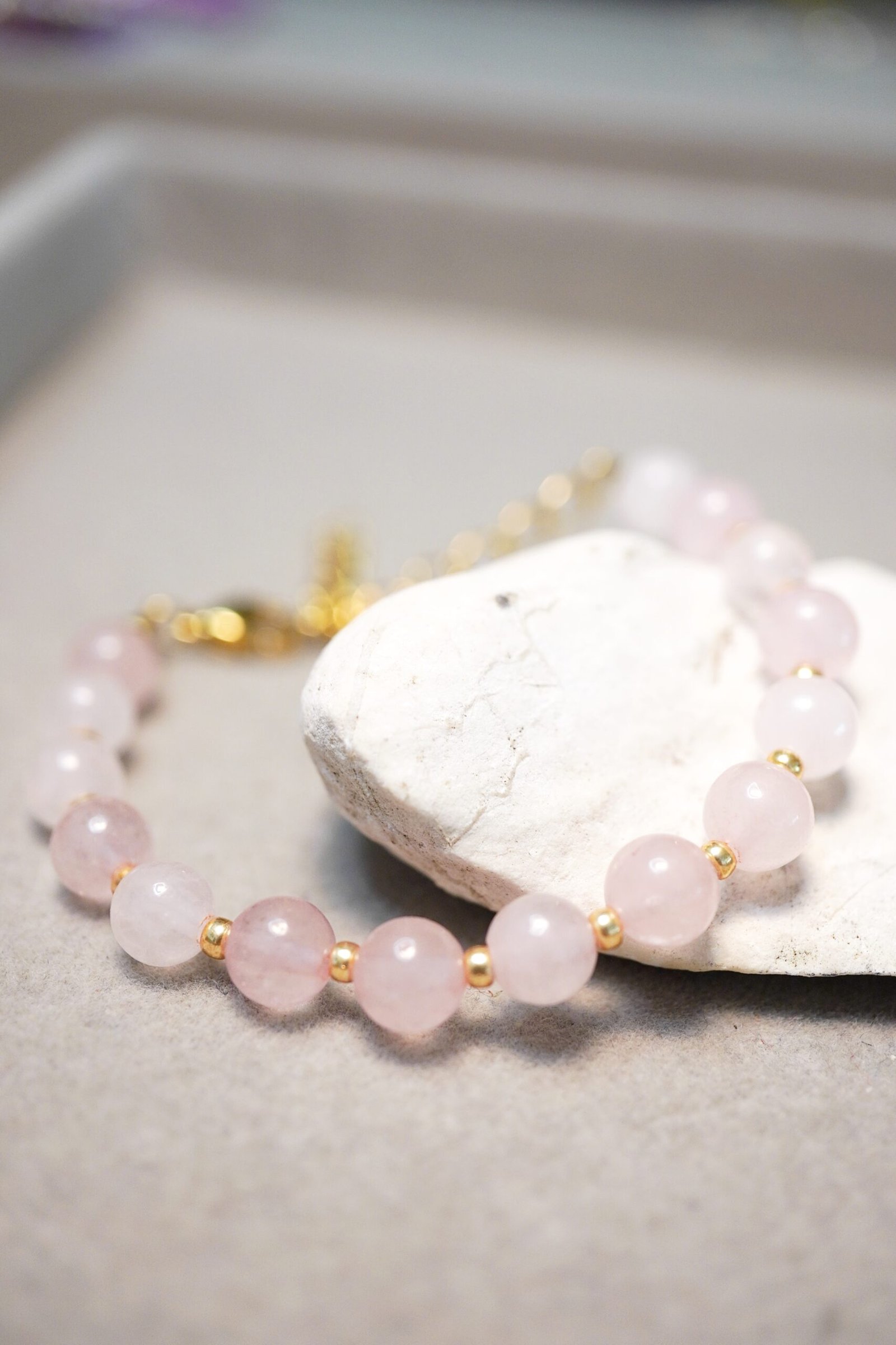 Handmade bracelet featuring natural rose quartz beads and minimalist metal spacers. Choose your finish: luxurious 18K gold plating or sleek stainless steel. Delicate, everyday-friendly, and perfect for stacking.